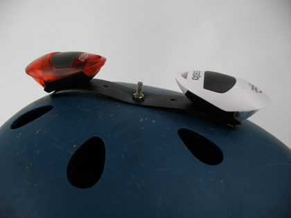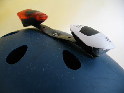 I solved a safety issue by mounting my bicycle lights on top of my helmet. My pair of Planet Bike Spock bicycle lights do an okay job of providing flashing safety light, but they’re definitely on the lower side of the brightness spectrum (and the white light is absolutely not a headlight, only a safety light).