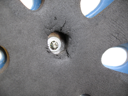 This is what the underneath side looks like. The hole from the helmet is rather large, so I had to stuff a larger washer in between the black foam and the blue plastic to lower the diameter (this wasn’t easy), then used another washer to accomodate the small-headed bolt.