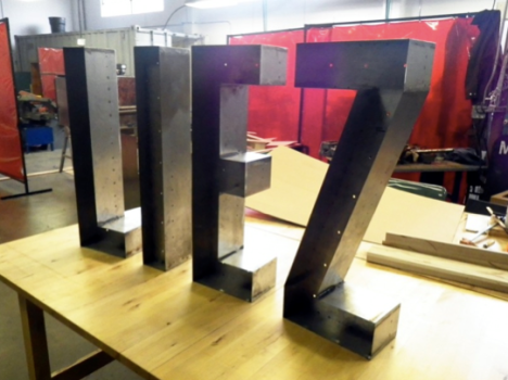 This is a lighted steel sign created for Sizzle Pie pizzeria. I worked as a fabrication assistant on this project; CAD design, measuring, cutting, welding set-up, and plenty of grinding. The main fabrication and welding was done by Sean Barrow.